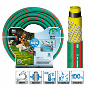 FITT NTS® Flash приятный на ощупь и элегантный на вид армированный шланг для полива для тех, кто любит практичность и качество в сочетании с доступной ценой. Шланг не скручивающийся со специальной оплеткой NTS (NO Torsion System - система противоскручивания) - по своему исполнению является 6-ти слойным, внутренний слой желтого цвета из пищевого ПВХ, защищен мощной пяти ступенчатой защитой от ультрафиолета и образования водорослей. Основные материалы, используемые для поливочного шланга не содержат кадмий, барий, свинец. Оплетка шланга с армировкой находящаяся в непосредственном контакте со слоями, подвергающимися давлению, предотвращает его разбухание и деформацию, придавая изделию постоянную стабильность и не скручиваемость.