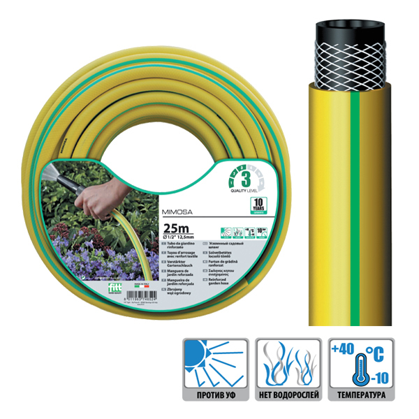 FITT MIMOSA – это армированный шланг повышенной прочности, который подойдет как для полупрофессионального использования в сельском хозяйстве, так и для интенсивного использования в саду.